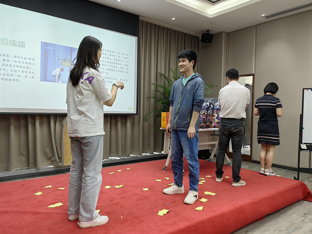 第二個環節是趣味游戲環節,游戲方式主要取自當下熱門娛樂節目《王牌對王牌》的經典游戲,結合公司實際,進行適當演變而成,內容包括“一起搖擺、‘心’火相傳、穿越‘火線’、慧眼識‘珠’、妙筆生花、火眼‘金’睛”等,均為競技類項目。參與人員隨機組成兩個小組進行PK,由工作人員在每輪游戲中對完成時間和完成結果兩個維度進行綜合測評,最終評選出優勝組獲得工會精心準備的零食大禮包。
