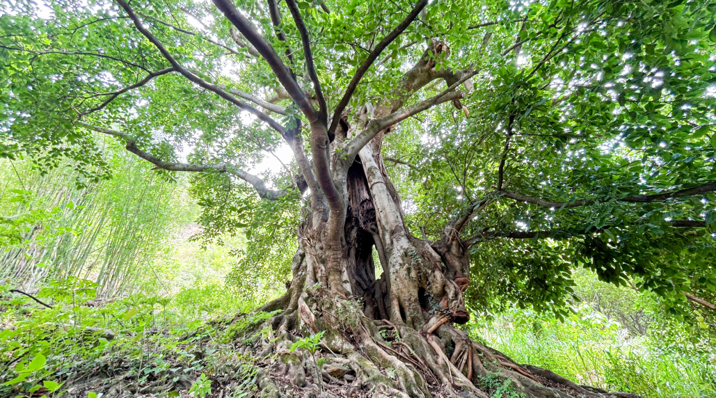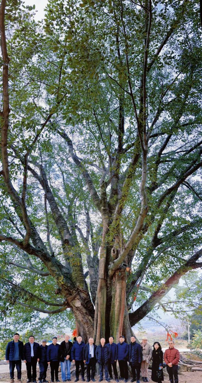 古樹資源也是海花溝的一大特色。項目范圍內有近200棵數百上千年的古樹沿主要道路呈帶狀分布,專家一行參觀的是園區的“千手觀音子母樹”和“七星古樹”。子母樹為同根而生的雙生樹,母樹根系在十余米外再次萌芽,生長為子樹。二者根系相連、枝葉相接、風姿相似,因母樹枝干如手臂向四周伸展,神似千手觀音,故被當地村民稱為“千手觀音子母樹”。“七星古樹”因生長方位分別與北斗七星——天樞、天璇、天璣、天權、玉衡、開陽、瑤光對應,故此得名。每年農歷三月三,七里八鄉的村民在此舉行“斗菜節”,祭祀樹神祈福新年。